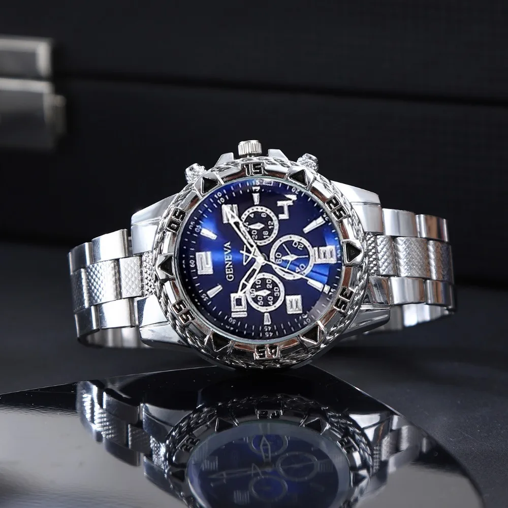 8pcs/set Men'sWatch Set with Blue Round Dial,Bracelet,Necklace,Ring-Fashionable Zinc Alloy Jewelry Set,Ideal Choice for Gifts.