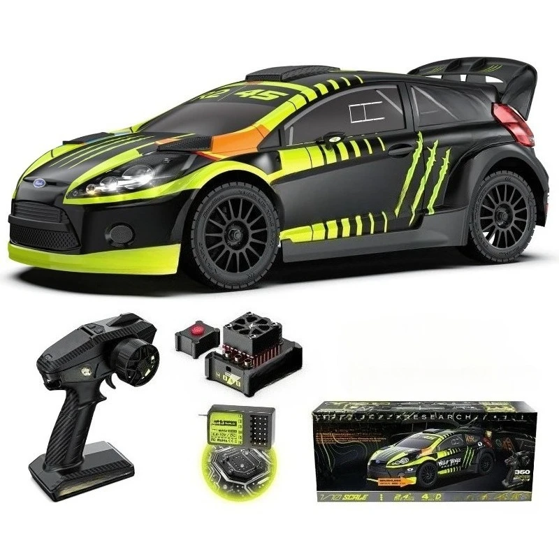 This Brushless RC Rally Car features a 60A ESC and a 3650-3300KV motor, both equipped with cooling fans and a metal heatsink, allowing the car to reach impressive speeds of up to 80KM/H when powered by attached 3S 2200mah battery.